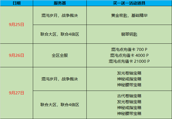 注:请广大玩家务必仔细确认活动日期和活动道具,非活动期间购买活动道具无法获得买一送一的奖励,请大家谅解!