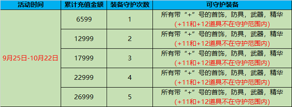 在活动期间单账号单服务器累计充值金额达到6599元、12999元、17999元、22999元、26999元均可获得不同次数的装备守护,每个账号最多可获得5次恢复机会。