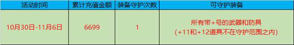 在活动期间单服务器累计充值达到6699元可获得一次装备守护机会,每个账号仅有一次恢复机会。