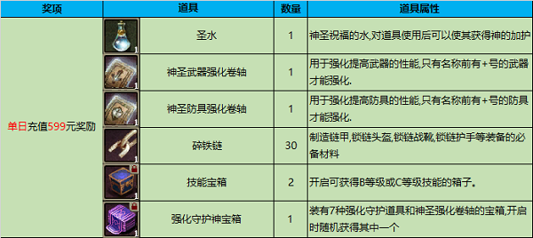 在活动期间,单日充值599元可获得以下奖励,奖励会在次日通过礼品箱发放。