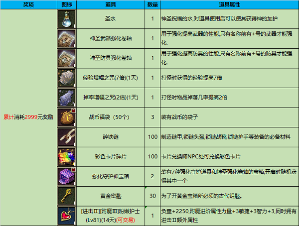 在活动期间,单日消耗2999金币可获得以下奖励,奖励会次日通过礼品箱发放。
