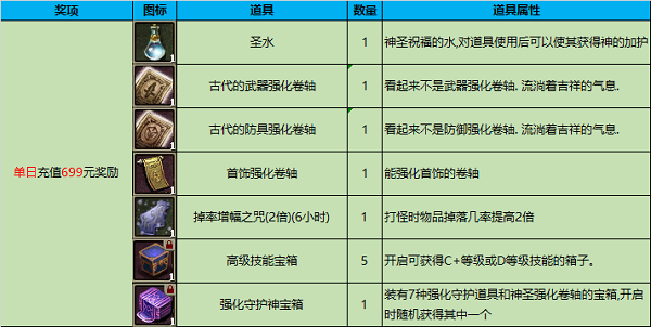 活动期间在单服务器服务器单日充值699元,可获得以下奖励,奖励将在次日通过礼品箱发放!