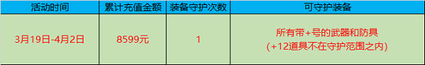 在活动期间单账号单服务器累计充值金额达到8599元可获得一次装备守护天使恢复次数,每个账号仅有一次恢复机会。