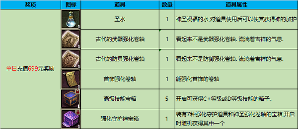 活动期间在单服务器服务器单日充值699元,可获得以下奖励,奖励将在次日通过礼品箱发放!