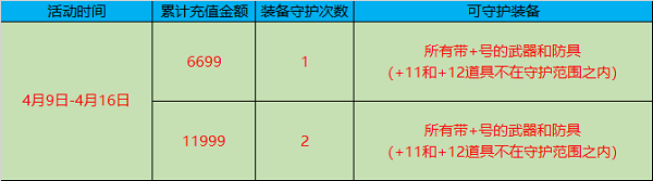 在活动期间单账号单服务器累计充值金额达到6699元、11999元可获得2次装备守护天使恢复次数,每个账号最多可获得2次恢复次数。