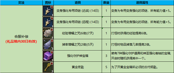 3.合服补偿均为绑定道具,自发放之日起在礼品箱内30日有效,到期消失,未领取导致消失无法进行补发。