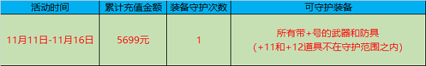 在活动期间单服务器累计充值达到5699元可获得一次装备守护机会,每个账号仅有一次充值恢复机会。
